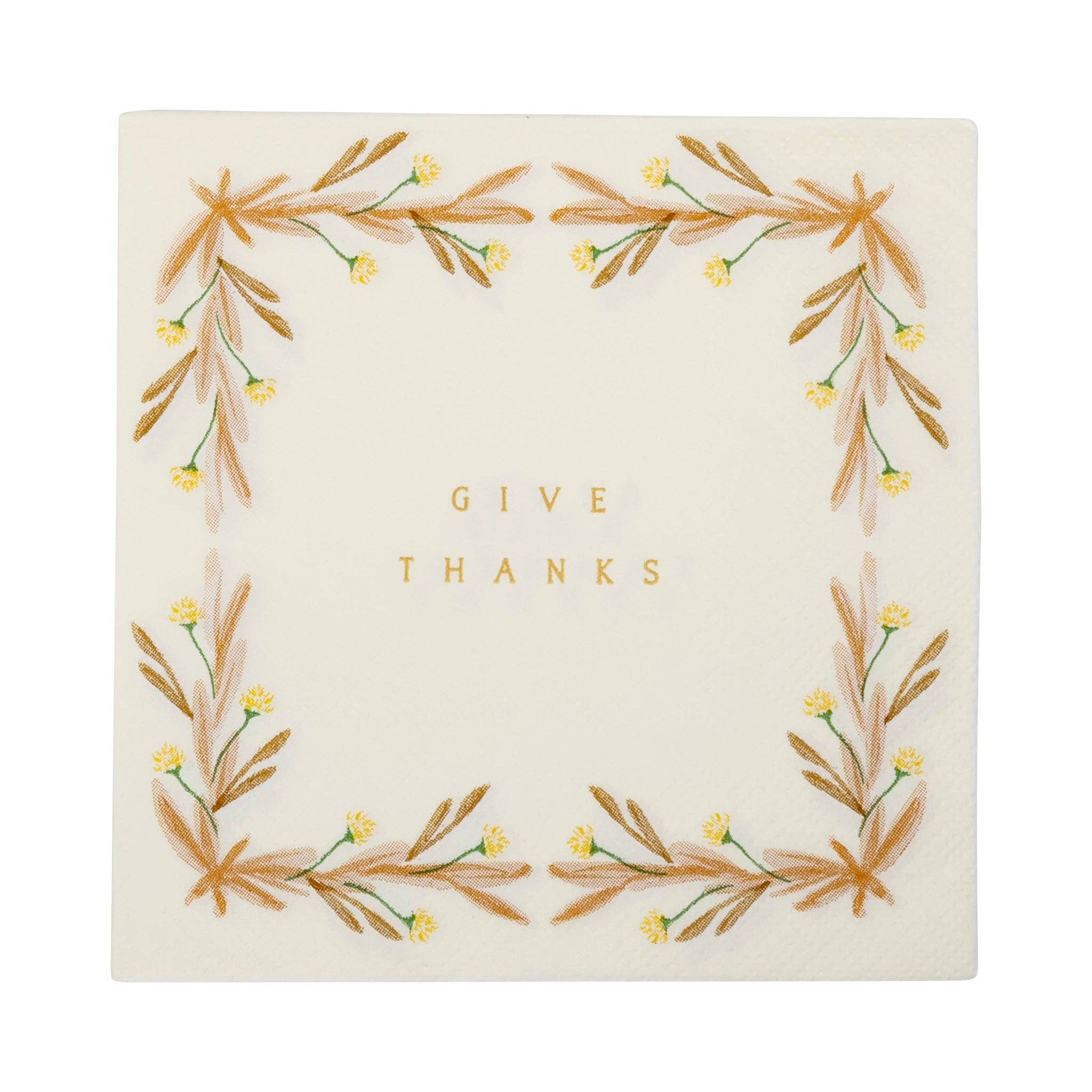 Elevate your harvest dinner with Give Thanks Cream Cocktail Napkins! These charming napkins feature the phrase "give thanks", making them the perfect addition to your fall festivities. • includes 24 paper cocktail napkins • 5 x 5" Note: Limited Run pieces may be carried by larger platform and box locations in your area.