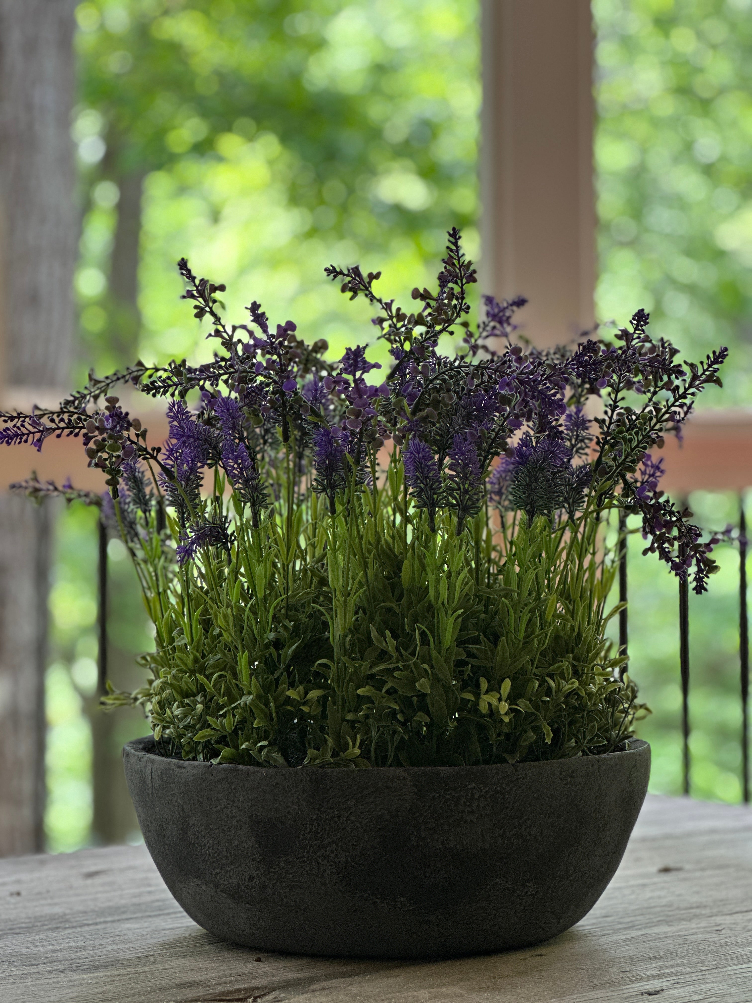A graceful bundle of lifelike lavender blooms, Lavande Élise evokes the serenity of a sun-drenched French garden. Nestled in a charcoal gray cement-look bowl, this everlasting arrangement is perfect for entry tables, shelves, or bedroom windowsills. No watering required — just year-round beauty and timeless charm.